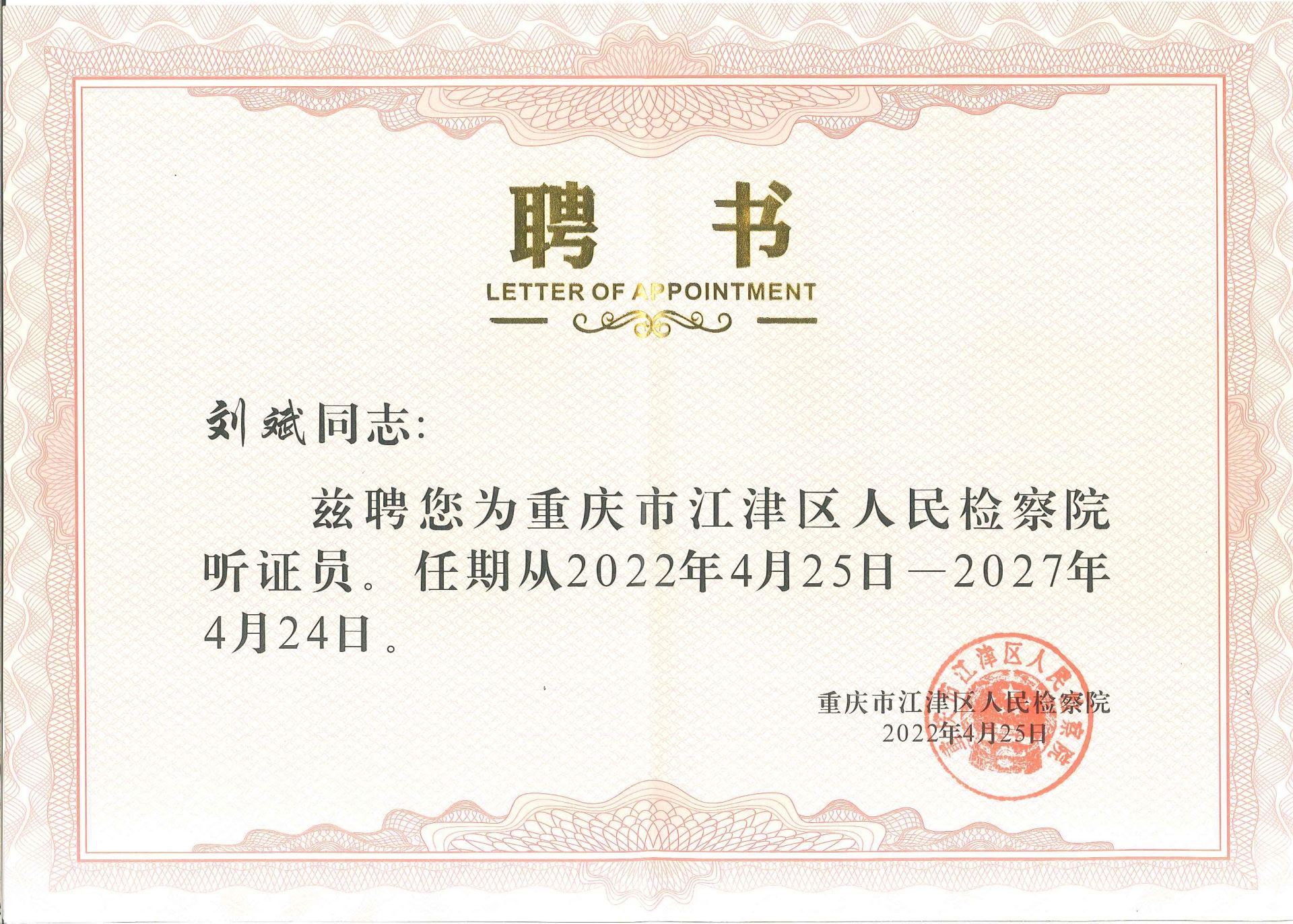 【新西亞鋁業(yè)集團(tuán)】重慶新西亞鋁業(yè)集團(tuán)董事長(zhǎng)兼總經(jīng)理劉斌受聘擔(dān)任江津區(qū)人民檢察院聽證員