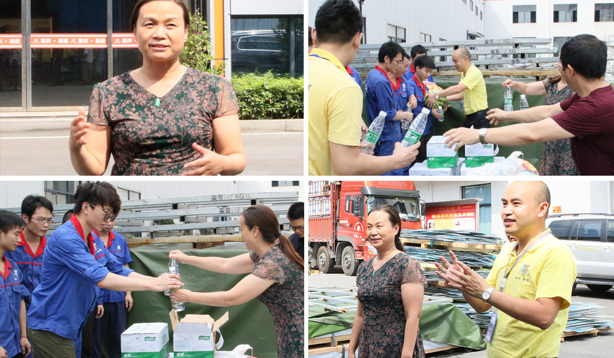 下午3點30分,區(qū)總工會羅主席一行來到鈑金車間生產場地,將西瓜、白糖、綠豆、礦泉水等防暑降溫慰問物品送到一線員工手中,羅主席親自將物品送到員工手中,對戰(zhàn)高溫、斗酷暑的一線員工表示了親切的慰問,并叮囑員工在完成好生產任務的同時,一定要保重身體。公司董事長劉斌、副總經(jīng)理兼工會主席傅明華對江津區(qū)總工會及園區(qū)工會冒著高溫酷暑親臨現(xiàn)場慰問員工表示衷心的感謝。劉斌董事長表示:羅主席親自將這些慰問物資送到公司,充分體現(xiàn)了黨和政府對西亞公司的關心,體現(xiàn)了區(qū)總工會領導對西亞公司的厚愛,我們一定不辜負上級領導的關懷,努力做好各方面的工作,努力為員工謀福利,努力為社會做貢獻。