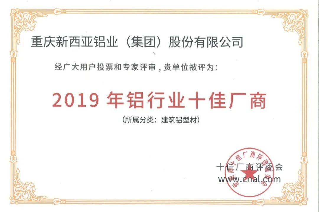 2019年10月,榮獲“2019年重慶十佳社會責任貢獻獎”“2019年鋁行業(yè)十佳廠商”稱號;