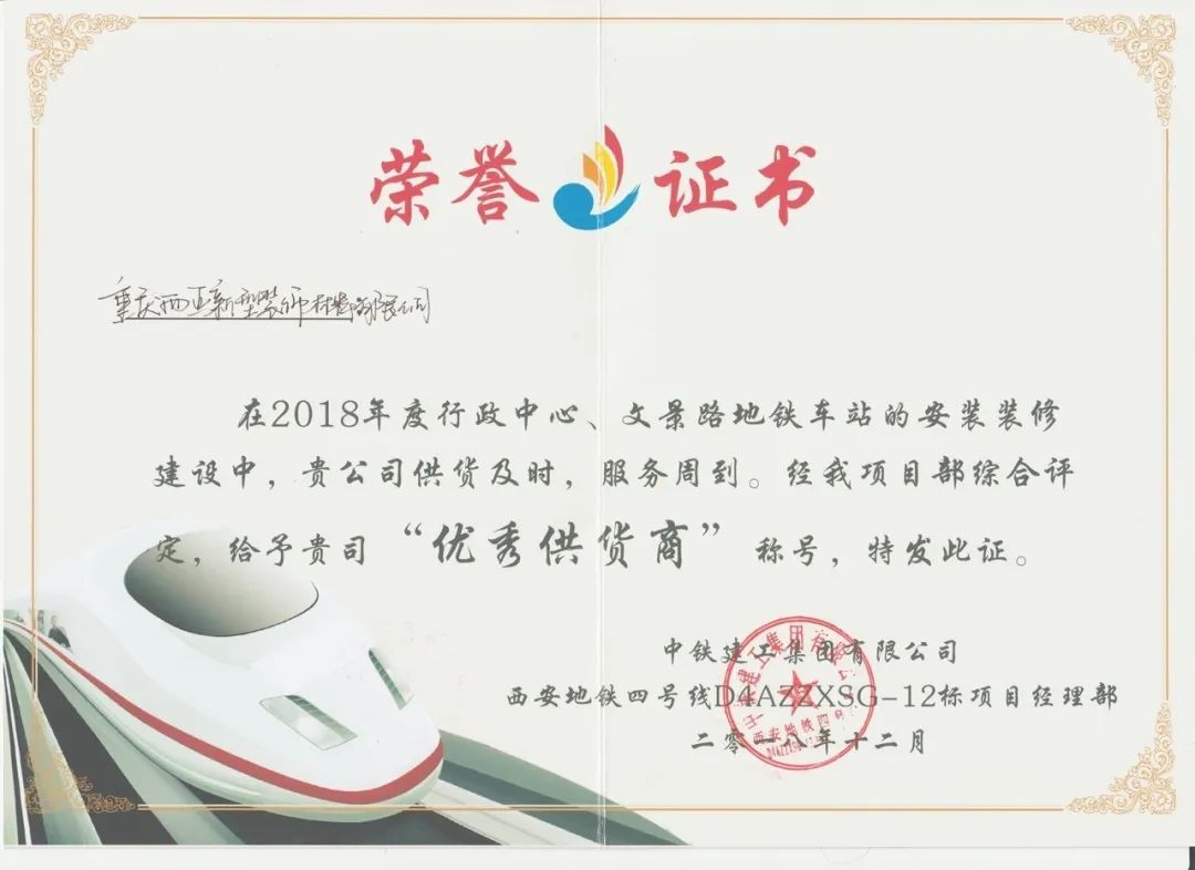 被中鐵建工集團有限公司西安地鐵四號線D4ZZXSG-12標項目經理部評為“優(yōu)秀供貨商”