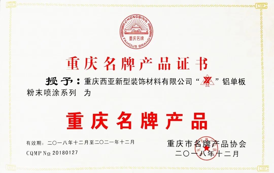 公司鋁單板粉末噴涂系列、氟碳二涂系列產品被授予重慶名牌產品