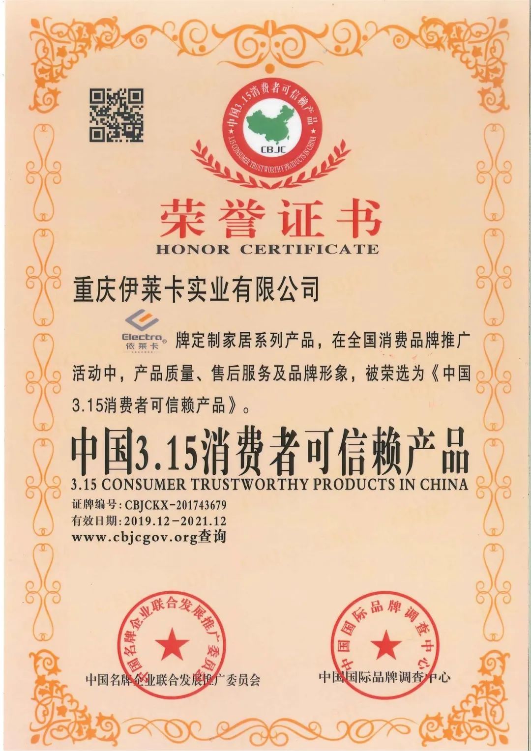 依萊卡全鋁家居牌定制家居系列產品被榮選為《中國3.15消費者可信賴產品》