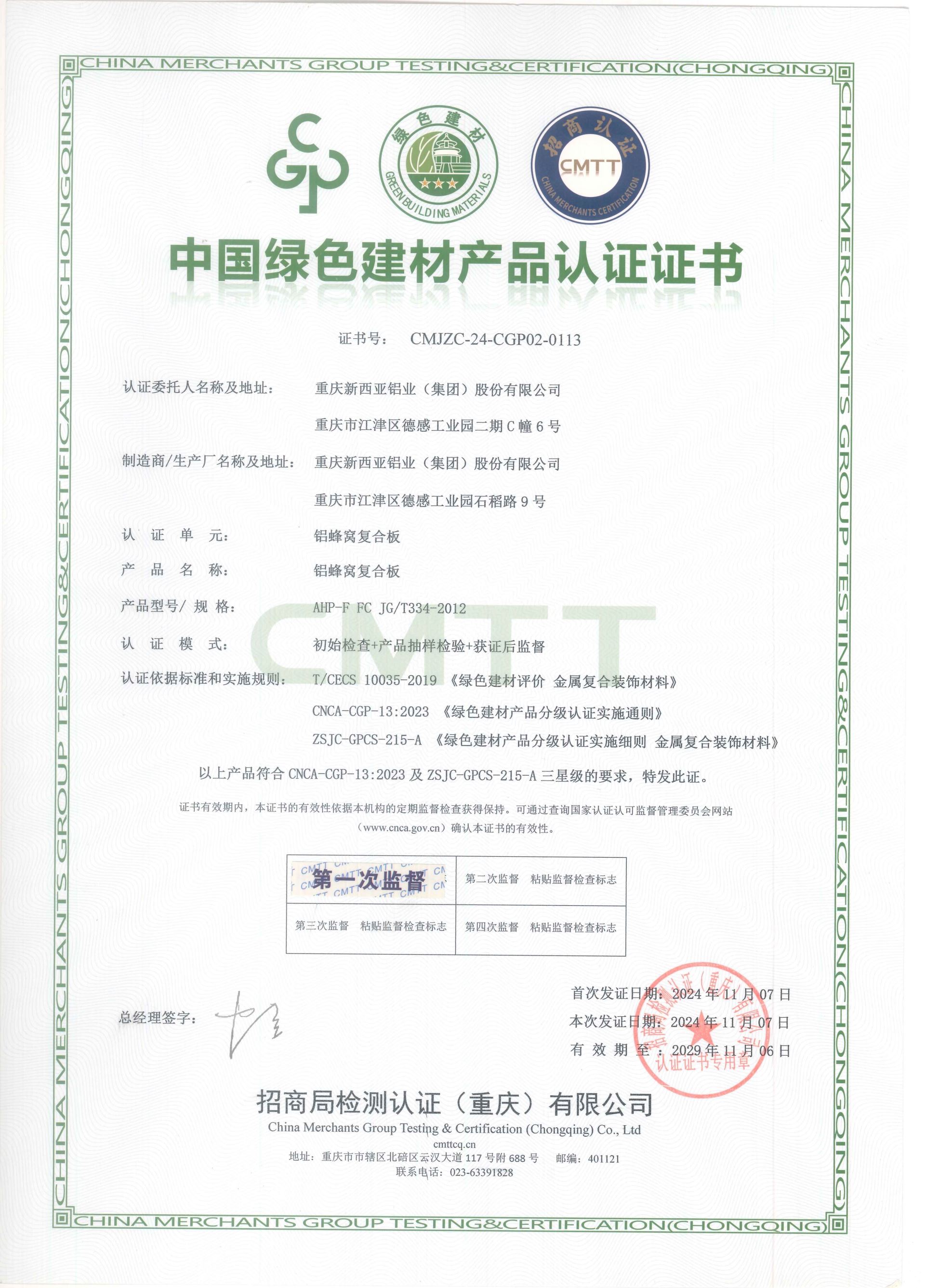 中國綠色建材產品認證(鋁蜂窩復合板)