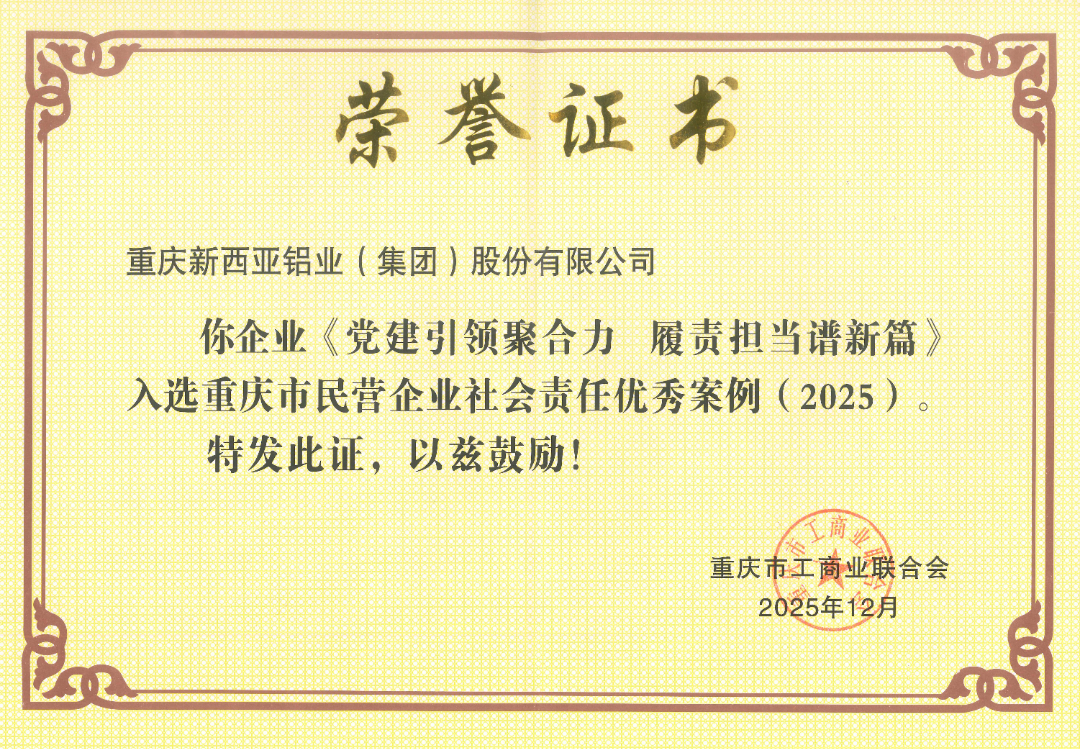 會議現(xiàn)場重磅發(fā)布了《重慶市民營企業(yè)社會責(zé)任報告(2025)》,并為獲得全國及市級優(yōu)秀案例的十五家先進代表頒發(fā)了證書。憑借在黨建引領(lǐng)、綠色發(fā)展及公益擔(dān)當?shù)确矫娴淖吭綄嵺`,重慶新西亞鋁業(yè)集團《黨建引領(lǐng)聚合力 履責(zé)擔(dān)當譜新篇》案例成功入選“2025重慶市民營企業(yè)社會責(zé)任優(yōu)秀案例”。
